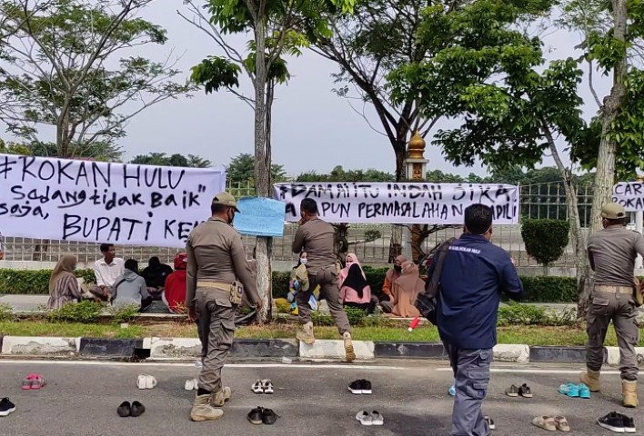Meski tidak melakukan orasi, para pengunjuk rasa ini mengungkapkan kekecewaan mereka dengan membentangkan poster dan spanduk di depan Kantor Bupati Rohul, hingga menarik perhatian para ASN dan warga yang melintas.
