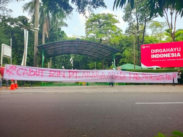 Sebagai bentuk protes puluhan mahasiswa ini melakukan Aksi dengan membentangkan spanduk sepanjang 20 meter di depan kementrian lingkungan hidup yang bertuliskan #cabut izin PT Arara Abadi Kabupaten Pelalawan Riau.