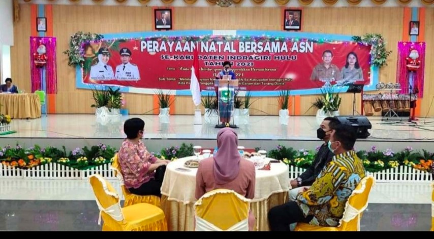 BUALBUAL.COM INHU - Bupati Indragiri Hulu (Inhu) Rezita Meylani Yopi SE Apresiasi acara Perayaaan Natal Aparatur Sipil Negara (ASN) Se- Inhu di gelar di Gedung Dang Purnama Kecamatan Rengat Minggu 19/12/2021.