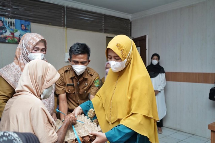 BUALBUAL.com - Ketua Koordinasi Kegiatan Kesejahteraan Sosial (K3S) Indragiri Hilir (Inhil), Hj.Zulaikhah Wardan melalui Dinas Sosial Inhil serahkan bantuan sembako bagi Lansia dan penyandang Disabilitas di Kantor Camat Tembilahan, Senin (21/12/2021).