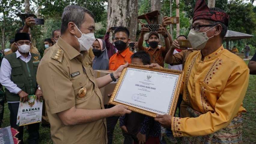 INHU | BUALBUAL.com - Gubernur Riau (Gubri) Syamsuar menyerahkan bantuan kepada masyarakat Talang Mamak yang ada di Desa Rantau Langsat, Kecamatan Kecamatan Gangsal, Indragiri Hulu, Senin (24/1/2022).