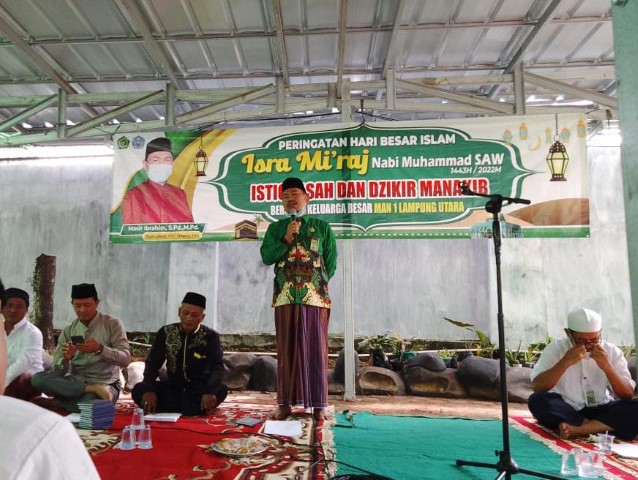 Kepala Sekolah MAN 1 kotabumi, Masir Ibrahim, MPd mengatakan, dalam sambutannya dengan menyampaikan sekilas Perjalanan Nabi Muhammad SAW. Ia bercerita bahwa dalam Isra’ Nabi Muhammad SAW menempuh suatu perjalanan dari Masjidil Haram ke Masjidil ‘Aqsha yang terletak di Palestina.