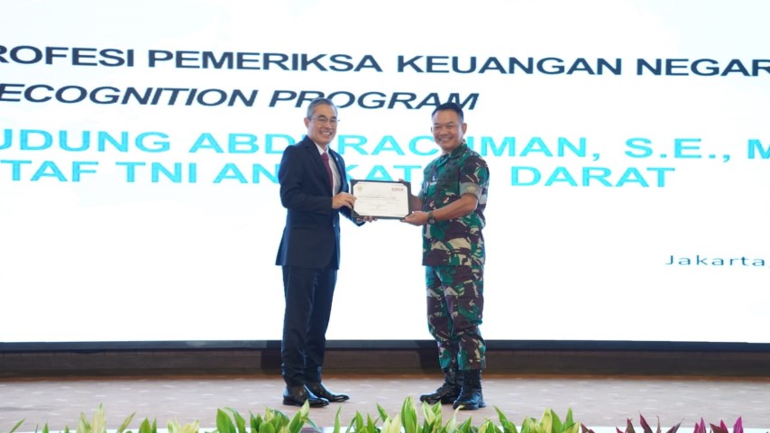 BUALBUAL.com - Kepala Staf Angkatan Darat Jenderal TNI Dudung Abdurachman SE MM dan Inspektur Jenderal Angkatan Darat (Irjenad) Mayjen TNI Rudianto menerima penyerahan Certified State Finance Auditor (CSFA) Recognition Program dari Badan Pemeriksa Keuangan Republik Indonesia (BPK RI).
