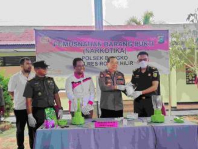 Pemusnahan yang dilaksanakan di Mapolsek Bangko tersebut secara langsung dipimpin Kapolsek Bangko Kompol Dedi Susanto SH dan disaksikan Wabup Rohil H Sulaiman SS MH, Wadanramil 01 Bangko Kapten Arh Simson Siregar, perwakilan Kejari Rohil, Dinas Kesehatan serta berbagai unsur lainnya.