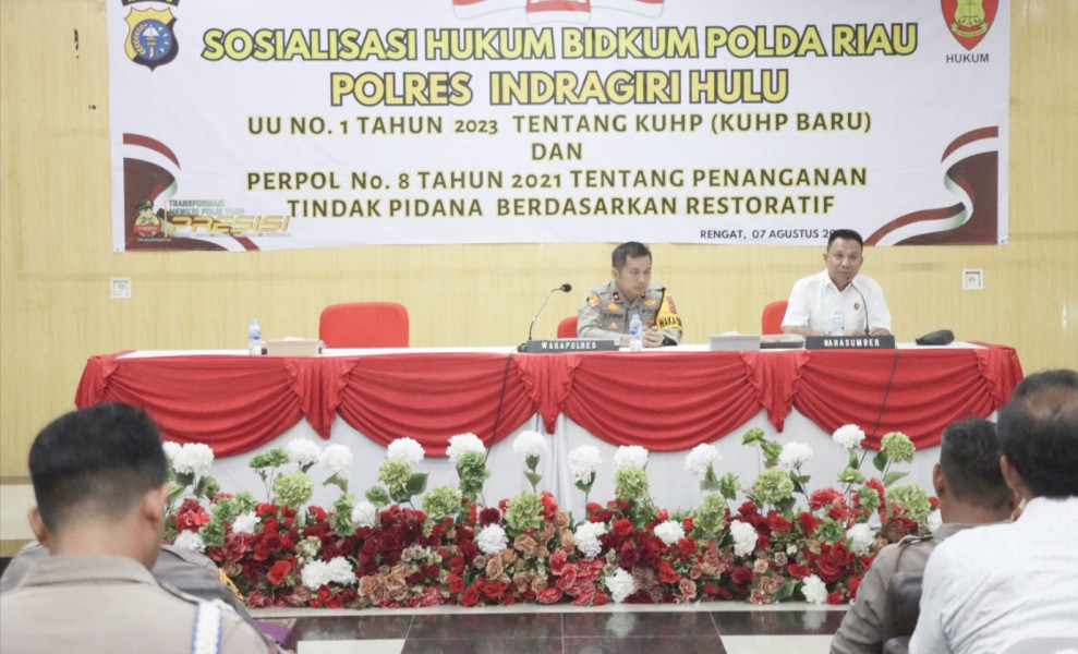 BUALBUAL.COM INHU - Tim dari Bidang Hukum (Bidkum) Polda Riau tahun anggaran 2024, melaksanakan sosialisasi tentang Undang-undang nomor: 1 tahun 203 tentang KHUP baru dan Perpol nomor: 8 tahun 2021 tentang tindak pidana restoratif.
